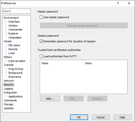 The Security page on the Preferences dialog allows you to configure how passwords are secured and what certificate authorities are trusted.