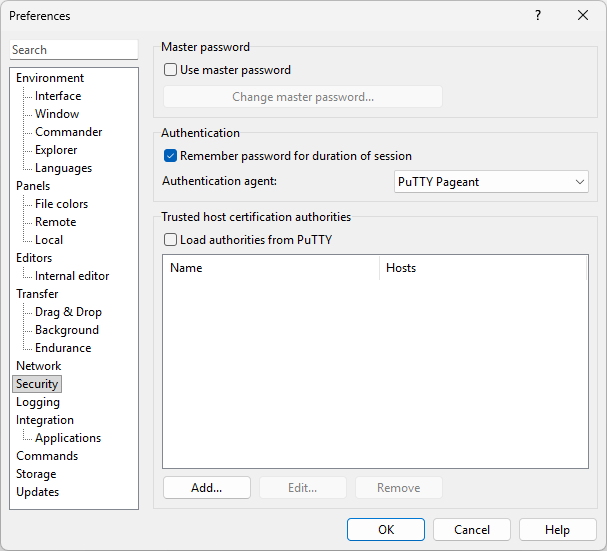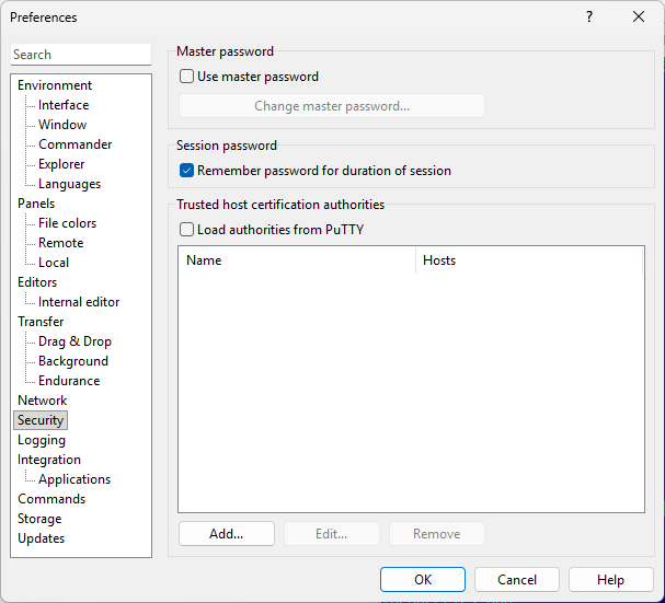 The Security page on the Preferences dialog allows you to configure how passwords are secured and what certificate authorities are trusted.