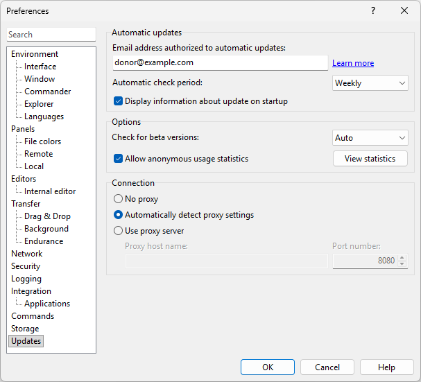 Use Allow anonymous usage statistics to control, if you allow WinSCP to collect non-personal usage statistics and send them to WinSCP team as part of the check for application updates. Before disabling this, please read, why it is important for us to know how you use WinSCP. Click View statistics to review statistics collected so far. The statistics are shown in an exact format as it is sent to us.