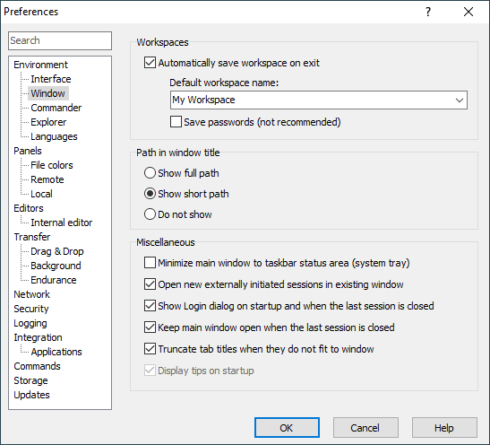 The Window tab allows you to configure display options of WinSCP window.