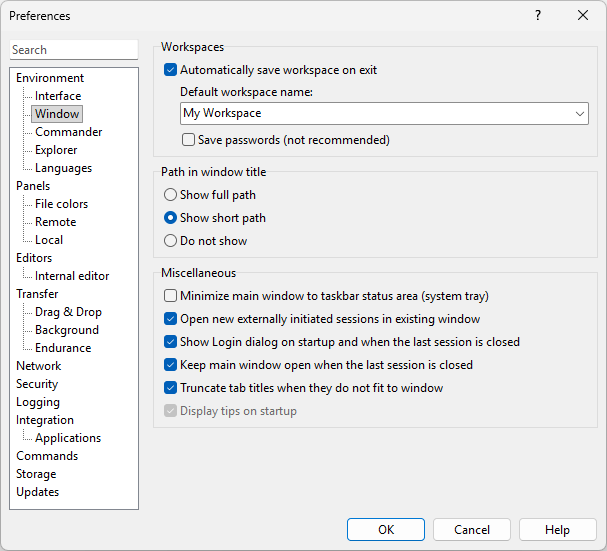 The Window tab on the Preferences dialog allows you to configure display options of WinSCP window.