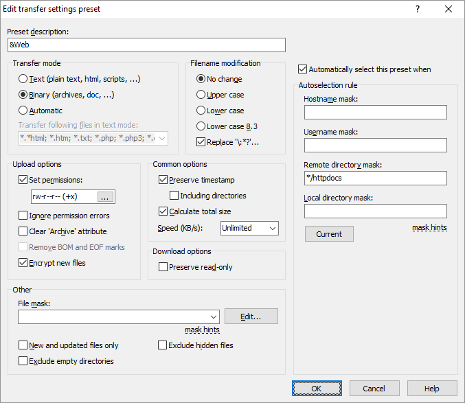 The Preset description box is where you type the name (or description) of the preset. You will see your preset under this name on Transfer Settings toolbar and other places. You can insert an ampersand (&) before a letter to make it a keyboard accelerator, for example &Web.