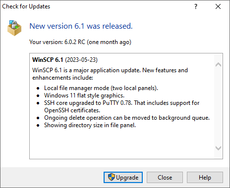 When automatic updates are enabled, the Upgrade button on the new version notification message will shut down the WinSCP, run a silent installation of the new version and restart WinSCP. If WinSCP was previously installed for all users, the upgrade will request Administrator permissions.