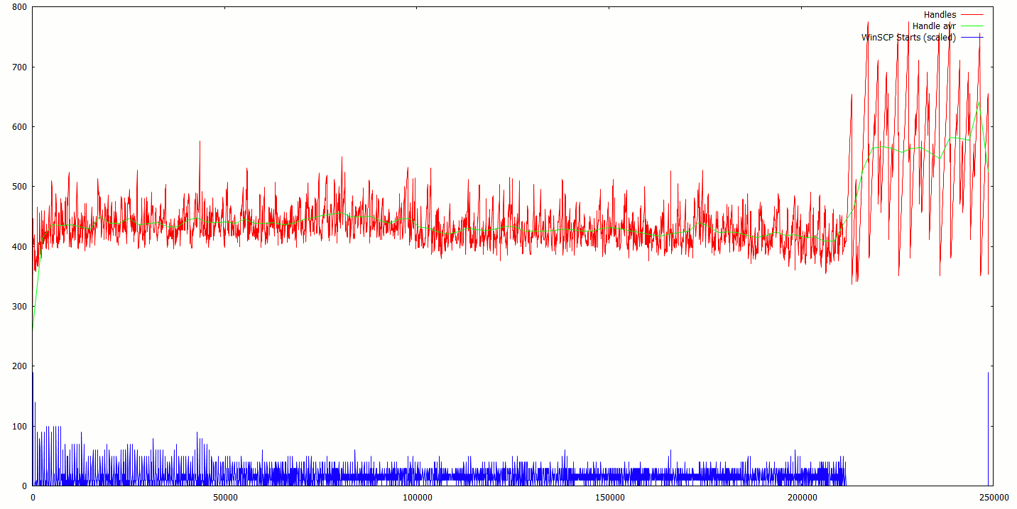 At that point, after WinSCP got that error, and my main thread has stopped (which prevents the program from running WinSCP anymore) then we see very erratic behaviour in the number of used handles, almost like something persistent in the WinSCP .NET assembly is still trying to recover and/or run a WinSCP process.