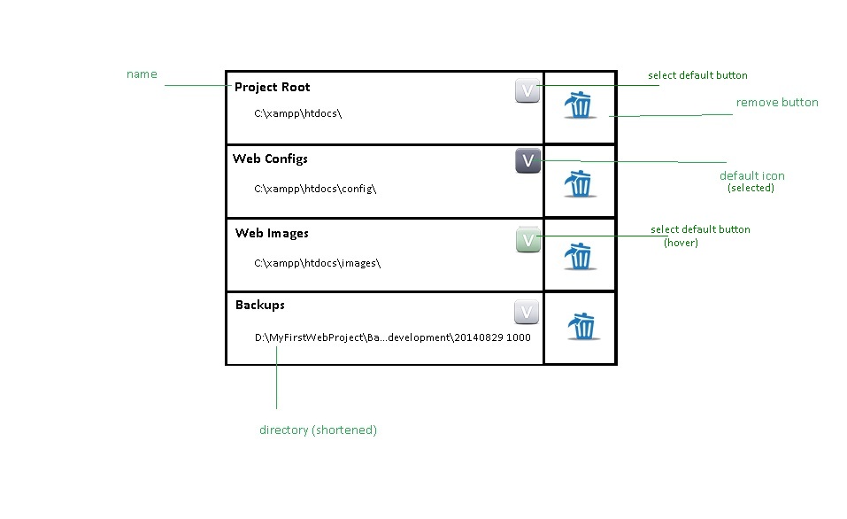 It consists of columns: an icon showing that shortcut is set as default (or button to set shortcut as default); wide "name+directory" field, remove from list button. First two colums (icon and "name+directory") open selected directory on click.