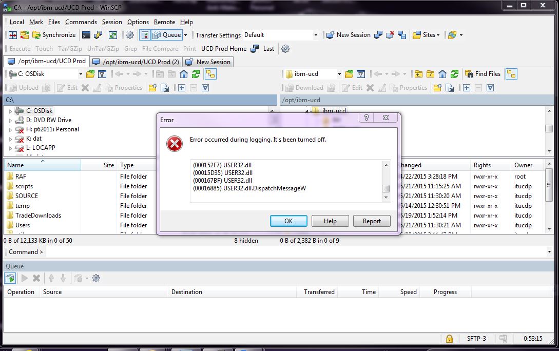 Not a lot of information I can provide. I have not transferred anything yet. Just setting up options. The error occurred when I clicked to close the highlighted session in the attached screenshot. It is still there, I am guessing it will close when I close the alert window