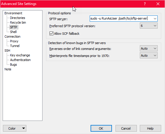 Basically the SFTP server field in Advanced Settings is a command line, so you only need to add the command to sudo as another user.