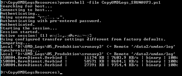 WinSCP.com <username>:<password>@<hostname> /command "synchronize local E:\UMD_Logs\04_ExternesTestsystem\srunavte2 /data1/umdav/log" exit