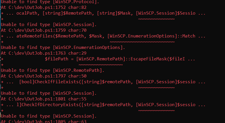 PS D:\> D:\testFTP.ps1 At D:\testFTP.ps1:14 char:29 + Protocol = [WinSCP.Protocol]::Sftp + ~~~~~~~~~~~~~~~ Unable to find type [WinSCP.Protocol]. At D:\testFTP.ps1:15 char:28 + FtpMode = [WinSCP.FtpMode]::Active + ~~~~~~~~~~~~~~ Unable to find type [WinSCP.FtpMode]. + CategoryInfo : ParserError: (:) [], ParentContainsErrorRecordException + FullyQualifiedErrorId : TypeNotFound