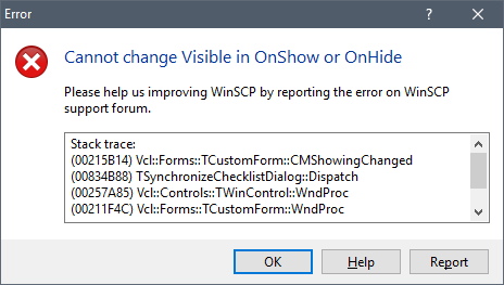 Problem occurs every time when trying to synchronize folders on WinSCP 5.10 beta (did work on previous version). It does not occur when synchronizing identical folders - only when there's something to sync. After dismissing error window, sync checklist appears empty.