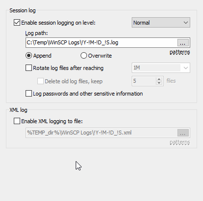 Under the Tools / Preferences / Logging: I want to let the Log Path = %Temp_Dir%\WinSCP Logs\!y-!M-!D_!S.log. This folder layout works if I replace the %Temp_Dir% with the actual drive and folder.