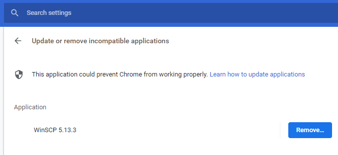 WinSCP causes Google Chrome to freezes randomly. It seems to be occurring when WinSCP uploads a file. If I manually kill the WinSCP process it unfreezes Google Chrome.