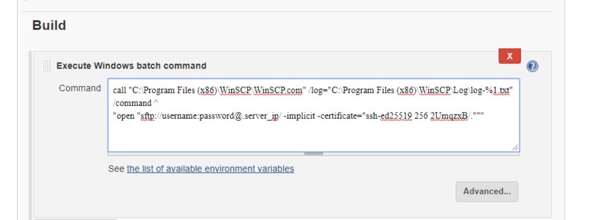 option confirm off option batch abort open sftp://username:password@server_ip -hostkey="ssh-ed25519 *****" synchronize -filemask="|.svn/; E:\WorkSpace\PHP\abc\.htaccess; E:\WorkSpace\PHP\abc\wp-config.php" remote "E:\WorkSpace\PHP\abc" /home/project/abc exit