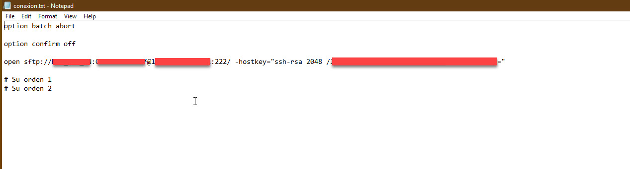 /command "option batch abort" "open sftp://user:pass@1url:222/"