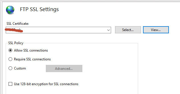 Now here's the problem.. I am trying to use FTPs (TLS/SSL Explicit) but unable to connect. I have created a Self Signed certificate, configured my FTP site to use the certificate, and I have also imported that self signed certificate on my local PC in the automatically selected cert store. I have also placed it in personal store locally. This was exported from my FTP server as a PFX file. I have also turned off the windows firewall on the FTP server for the sake of troubleshooting.