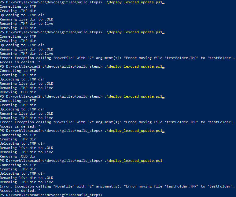 Hello, I have strange problem with WinSCP asssembly and powershell script. In script, I want to create tmp folder, upload files, rename old target directory, rename tmp to target and remove old. In first run, it works, in second run, library reports error on folder, which created few moments ago. And on third run, it removes this folder, 4th run access denied, and so on.. Look into attachment, there is console and logs for good and bad run I can't find error, can someone help me?