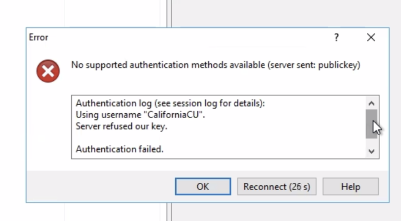 2. However during login to ubuntu instance via WinScp, receiving the error "No supported authentication methods available (server sent: publickey)". Log attached.