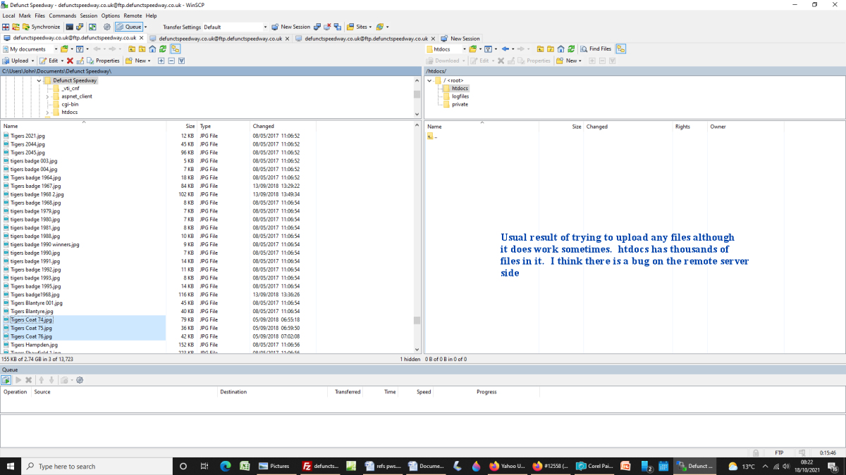 Files fail to upload. The server shows a folder with 2 dots after it