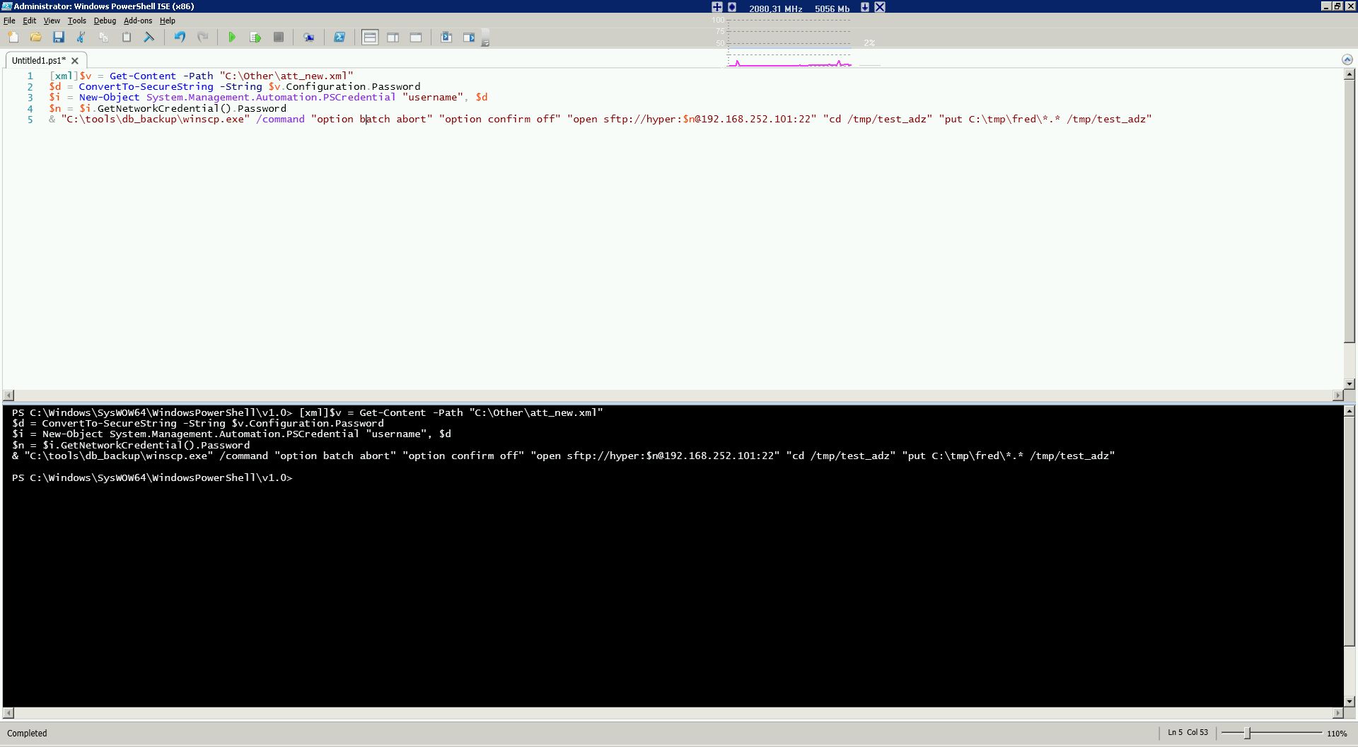 echo "Mapowanie serwera_new_sitplan" > $logatt [xml]$v = Get-Content -Path "C:\Other\att_new.xml" $d = ConvertTo-SecureString -String $v.Configuration.Password $i = New-Object System.Management.Automation.PSCredential "username", $d $n = $i.GetNetworkCredential().Password & "C:\tools\db_backup\winscp.exe" /command "option batch abort" "option confirm off" "open sftp://hyper:$n@192.168.153.101:22" "cd /tmp/test_adz" "put C:\tmp\fred\*.* /tmp/test_adz" $? Start-Sleep -Seconds 300