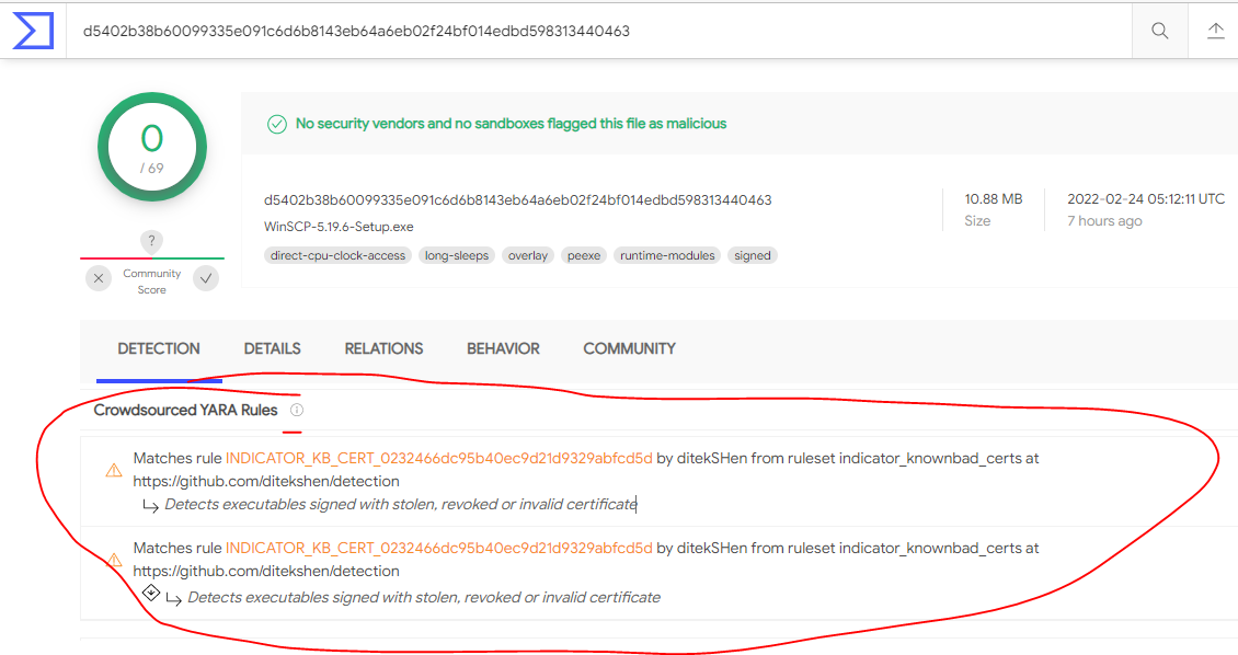According to VirusTotal WinSCP-5.19.6-Setup.exe signed with "signed with stolen, revoked or invalid certificate"
