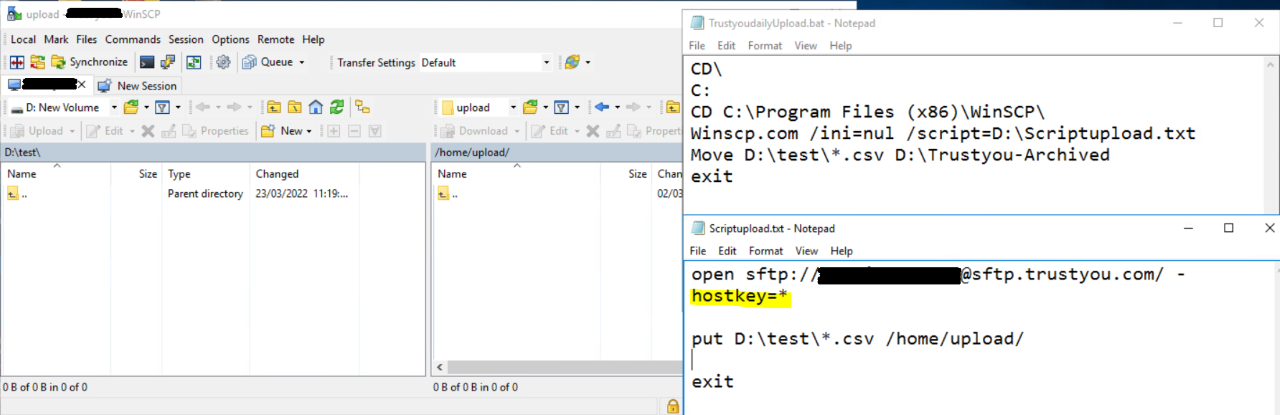 I have issued to set schedule automatic upload text file to WinSCP through SFTP by using private key and public key. At the current, the Window Task Scheduler is running as normal but the text file was not automatically upload. WinSCP always require logging in before uploading. I think that I put something wrong in the scripts.