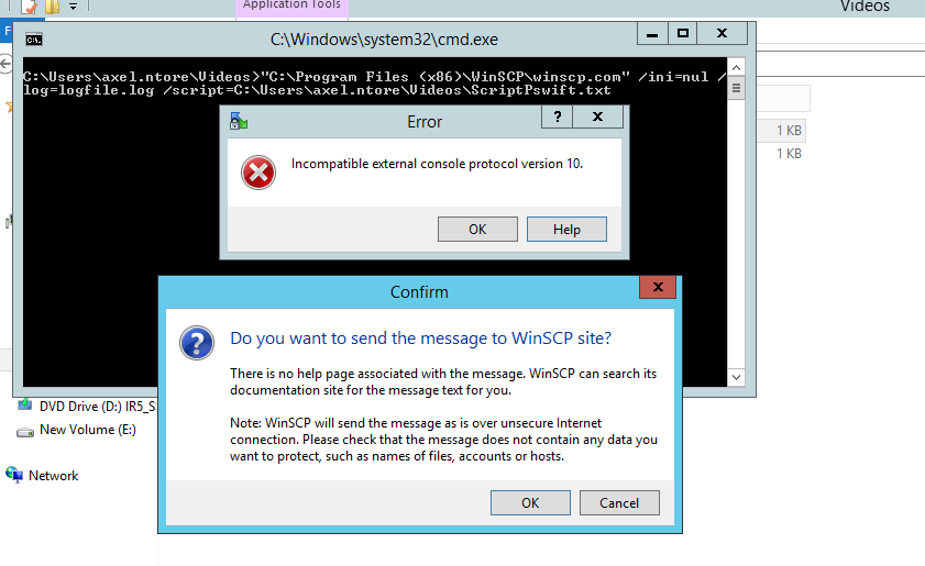 When I check the forum I noticed that you mentioned for Incompatible External Console Protocol Version 5 , 7 that there was a mismatch of version (winscp.exe and winscp.net) but i am not sure how to check this one too (please advise if that is what could be the cause)