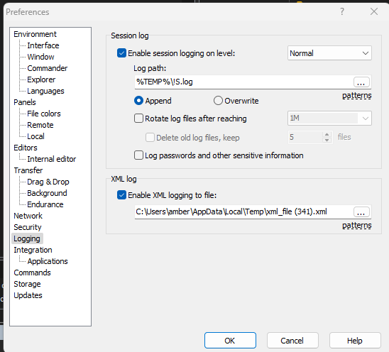 %TEMP%\!S.log, then it logs to your Windows account temporary directory (i.e. typically to C:\Users\username\AppData\Local\Temp) to a file with the same name as your WinSCP session. If you want WinSCP to log to a more convenient location, specify it in preferences.
