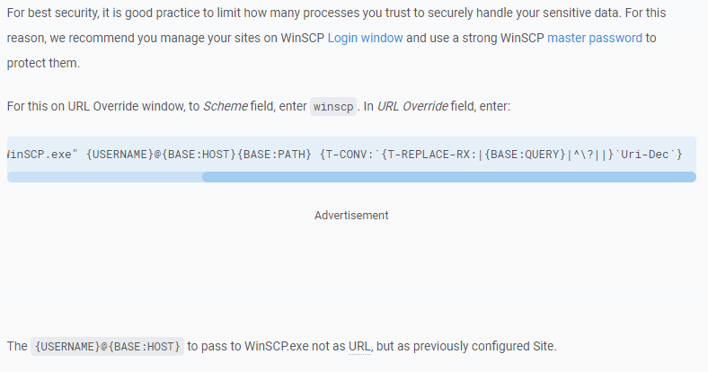cmd://"{ENV_PROGRAMFILES_X86}\WinSCP\WinSCP.exe" {USERNAME}@{BASE:HOST}{BASE:PATH} {T-CONV:`{T-REPLACE-RX:|{BASE:QUERY}|^\?||}`Uri-Dec`}