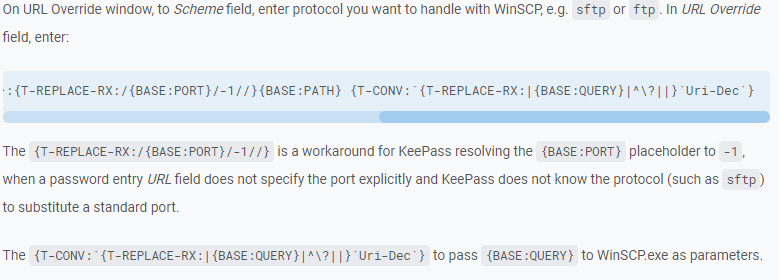 The ''%%{T-REPLACE-RX:/{BASE:PORT}/-1//}%%'' is a workaround for KeePass resolving the ''{BASE:PORT}'' placeholder to ''-1'', when a password entry //%%URL%%// field does not specify the port explicitly and KeePass does not know the protocol (such as ''sftp'') to substitute a standard port.