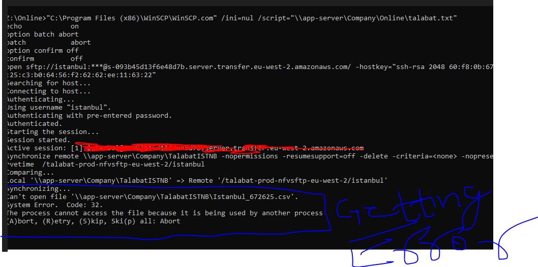open sftp://xxx/ -hostkey="ssh-rsa xxxxx" synchronize remote \\server\Company\TalabatISTNB -nopermissions -resumesupport=off -delete -criteria=<none> -nopreservetime /talabat-prod-nfvsftp-eu-west-2/istanbul exit