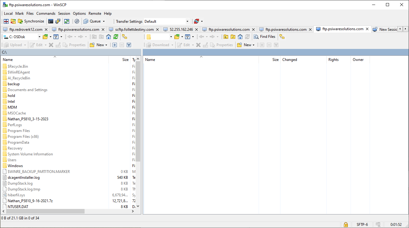 . 2023-11-10 07:37:53.535 -------------------------------------------------------------------------- . 2023-11-10 07:37:53.535 WinSCP Version 6.1.2 (Build 13797 2023-09-19) (OS 10.0.17763 – Windows Server 2019 Datacenter) . 2023-11-10 07:37:53.535 Configuration: HKCU\Software\Martin Prikryl\WinSCP 2\ . 2023-11-10 07:37:53.535 Log level: Normal . 2023-11-10 07:37:53.535 Local account: CCSD\tf_admin . 2023-11-10 07:37:53.535 Working directory: C:\xfer_scripts . 2023-11-10 07:37:53.535 Process ID: 1836 . 2023-11-10 07:37:53.551 Ancestor processes: WinSCP, cmd, explorer, ... . 2023-11-10 07:37:53.551 Command-line: "C:\xfer_scripts\WinSCP-6.1.2-Portable\WinSCP.exe" /console=6.1.2 /consoleinstance=_13232_848 "/console" "/script=C:\xfer_scripts\review360_script-2.txt" "/log=c:\xfer_scripts\log.txt" . 2023-11-10 07:37:53.551 Time zone: Current: GMT-5, Standard: GMT-5 (Eastern Standard Time), DST: GMT-4 (Eastern Daylight Time), DST Start: 3/12/2023, DST End: 11/5/2023 . 2023-11-10 07:37:53.551 Login time: Friday, November 10, 2023 7:37:53 AM . 2023-11-10 07:37:53.551 -------------------------------------------------------------------------- . 2023-11-10 07:37:53.551 Script: Retrospectively logging previous script records: > 2023-11-10 07:37:53.551 Script: option confirm off < 2023-11-10 07:37:53.551 Script: confirm off > 2023-11-10 07:37:53.551 Script: option batch on < 2023-11-10 07:37:53.551 Script: batch on > 2023-11-10 07:37:53.551 Script: open CharlestonCountySchoolDistrict:***@ftp.psiwaresolutions.com . 2023-11-10 07:37:53.551 -------------------------------------------------------------------------- . 2023-11-10 07:37:53.551 Session name: <username redacted>@ftp.psiwaresolutions.com (Ad-Hoc site) . 2023-11-10 07:37:53.551 Host name: ftp.psiwaresolutions.com (Port: 22) . 2023-11-10 07:37:53.551 User name: <username redacted> (Password: Yes, Key file: No, Passphrase: No) . 2023-11-10 07:37:53.551 Tunnel: No . 2023-11-10 07:37:53.551 Transfer Protocol: SFTP (SCP) . 2023-11-10 07:37:53.551 Ping type: Off, Ping interval: 30 sec; Timeout: 15 sec . 2023-11-10 07:37:53.551 Disable Nagle: No . 2023-11-10 07:37:53.551 Proxy: None . 2023-11-10 07:37:53.551 Send buffer: 262144 . 2023-11-10 07:37:53.551 Compression: No . 2023-11-10 07:37:53.551 Bypass authentication: No . 2023-11-10 07:37:53.551 Try agent: Yes; Agent forwarding: No; KI: Yes; GSSAPI: Yes . 2023-11-10 07:37:53.551 GSSAPI: KEX: No; Forwarding: No; Libs: gssapi32,sspi,custom; Custom: . 2023-11-10 07:37:53.551 Ciphers: aes,chacha20,aesgcm,3des,WARN,des,blowfish,arcfour; Ssh2DES: No . 2023-11-10 07:37:53.551 KEX: ntru-curve25519,ecdh,dh-gex-sha1,dh-group18-sha512,dh-group17-sha512,dh-group16-sha512,dh-group15-sha512,dh-group14-sha1,rsa,WARN,dh-group1-sha1 . 2023-11-10 07:37:53.551 SSH Bugs: Auto,Auto,Auto,Auto,Auto,Auto,Auto,Auto,Auto,Auto . 2023-11-10 07:37:53.551 Simple channel: Yes . 2023-11-10 07:37:53.551 Return code variable: Autodetect; Lookup user groups: Auto . 2023-11-10 07:37:53.551 Shell: default . 2023-11-10 07:37:53.551 EOL: LF, UTF: Auto . 2023-11-10 07:37:53.551 Clear aliases: Yes, Unset nat.vars: Yes, Resolve symlinks: Yes; Follow directory symlinks: No . 2023-11-10 07:37:53.551 LS: ls -la, Ign LS warn: Yes, Scp1 Comp: No; Exit code 1 is error: No . 2023-11-10 07:37:53.551 SFTP Bugs: Auto,Auto . 2023-11-10 07:37:53.551 SFTP Server: default . 2023-11-10 07:37:53.551 Local directory: default, Remote directory: home, Update: Yes, Cache: Yes . 2023-11-10 07:37:53.551 Cache directory changes: Yes, Permanent: Yes . 2023-11-10 07:37:53.551 Recycle bin: Delete to: No, Overwritten to: No, Bin path: . 2023-11-10 07:37:53.551 DST mode: Unix . 2023-11-10 07:37:53.551 -------------------------------------------------------------------------- < 2023-11-10 07:37:53.551 Script: Searching for host... . 2023-11-10 07:37:53.566 Looking up host "ftp.psiwaresolutions.com" for SSH connection . 2023-11-10 07:37:53.613 Connecting to 54.210.46.187 port 22 . 2023-11-10 07:37:53.645 Connected to 54.210.46.187 < 2023-11-10 07:37:53.645 Script: Connecting to host... . 2023-11-10 07:37:53.645 We claim version: SSH-2.0-WinSCP_release_6.1.2 . 2023-11-10 07:37:53.645 Connected to 54.210.46.187 . 2023-11-10 07:37:53.660 Remote version: SSH-2.0-CerberusFTPServer_11.0 . 2023-11-10 07:37:53.660 Using SSH protocol version 2 . 2023-11-10 07:37:53.676 Have a known host key of type rsa2 . 2023-11-10 07:37:53.691 Doing ECDH key exchange with curve nistp256, using hash SHA-256 . 2023-11-10 07:37:53.770 Host key fingerprint is: . 2023-11-10 07:37:53.770 ssh-rsa 2048 SHA256:eT405UXuSy+vpixAtS7OkjVrOhoeY3qUodo6Coeoxbg < 2023-11-10 07:37:53.770 Script: Authenticating... . 2023-11-10 07:37:53.770 Host key matches cached key . 2023-11-10 07:37:53.770 Initialised AES-256 SDCTR (AES-NI accelerated) [aes256-ctr] outbound encryption . 2023-11-10 07:37:53.770 Initialised HMAC-SHA-256 outbound MAC algorithm . 2023-11-10 07:37:53.785 Initialised AES-256 SDCTR (AES-NI accelerated) [aes256-ctr] inbound encryption . 2023-11-10 07:37:53.785 Initialised HMAC-SHA-256 inbound MAC algorithm ! 2023-11-10 07:37:53.801 Using username "<username redacted>". < 2023-11-10 07:37:53.801 Script: Using username "<username redacted>". . 2023-11-10 07:37:53.832 Server offered these authentication methods: password,publickey . 2023-11-10 07:37:53.832 Prompt (password, "SSH password", <no instructions>, "&Password: ") . 2023-11-10 07:37:53.832 Using stored password. < 2023-11-10 07:37:53.832 Script: Authenticating with pre-entered password. . 2023-11-10 07:37:53.832 Sent password . 2023-11-10 07:37:53.848 Access granted . 2023-11-10 07:37:53.848 Opening main session channel . 2023-11-10 07:37:53.863 Opened main channel . 2023-11-10 07:37:53.895 Started a shell/command < 2023-11-10 07:37:53.895 Script: Authenticated. . 2023-11-10 07:37:53.895 -------------------------------------------------------------------------- . 2023-11-10 07:37:53.895 Using SFTP protocol. . 2023-11-10 07:37:53.895 Doing startu