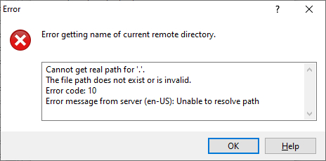 After I close out that error prompt a few times, it ends with the error "Error getting name of current remote directory" and I have a blank right half of the commander-style screen (screen shots attached).Cannot get real path for '.'.