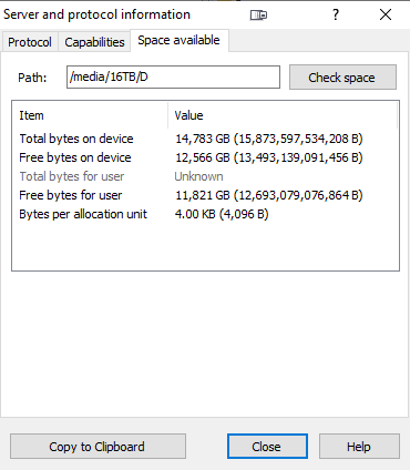 I'd created several subfolders on that drive and I'd successfully copied thousands of files over. I saw there was a 16GB file in the root of the drive that I wanted to move to a folder (/media/16TB/D) so I right-clicked on it, selected "Move To" and typed in the target folder. It seemed to be taking a long time, considering that it just needed to move the file from one folder on the server to another, and then WinSCP started showing errors about other files and quotas, even though I haven't got the quota tools installed on the server and haven't set any quotas. When I looked at the folder after that all the files were gone, apart from the one that I was trying to move, and even that hadn't been created properly.