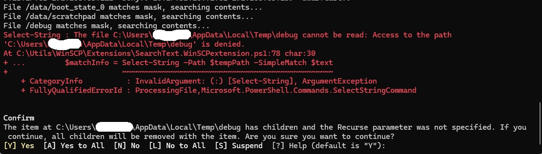 File /data/boot_state_0 matches mask, searching contents... File /data/scratchpad matches mask, searching contents... File /debug matches mask, searching contents... Select-String : The file C:\Users\XXXXXXX\AppData\Local\Temp\debug cannot be read: Access to the path 'C:\Users\XXXXXXX\AppData\Local\Temp\debug' is denied. At C:\Utils\WinSCP\Extensions\SearchText.WinSCPextension.ps1:78 char:30 + ... $matchInfo = Select-String -Path $tempPath -SimpleMatch $text + ~~~~~~~~~~~~~~~~~~~~~~~~~~~~~~~~~~~~~~~~~~~~~~~~ + CategoryInfo : InvalidArgument: (:) [Select-String], ArgumentException + FullyQualifiedErrorId : ProcessingFile,Microsoft.PowerShell.Commands.SelectStringCommand Confirm The item at C:\Users\XXXXXXX\AppData\Local\Temp\debug has children and the Recurse parameter was not specified. If you continue, all children will be removed with the item. Are you sure you want to continue? [Y] Yes [A] Yes to All [N] No [L] No to All [S] Suspend [?] Help (default is "Y"):